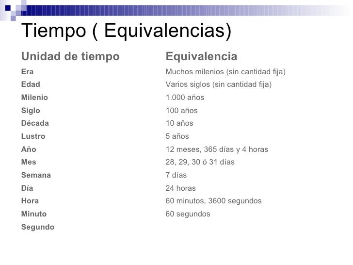 - Tabla de equivalencias de tiempo